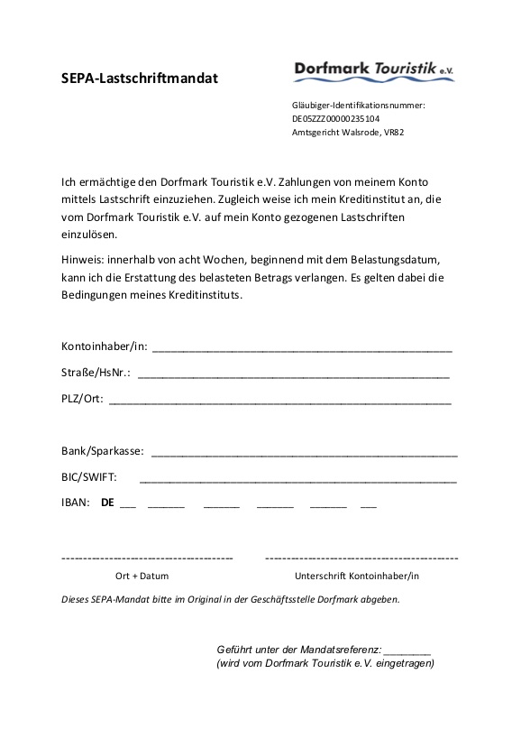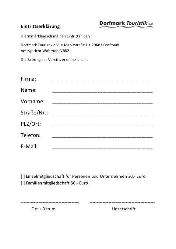 Der Dorfmark Touristik e.V. ist offen für Einzelpersonen, Familien, Beherbergungsbetriebe, Gastronomie, Künstler, Gewerbebetriebe, Dienstleistungsbetriebe und Fördermitglieder. Der Jahresbeitrag für Unternehmen und Einzelpersonen beträgt 30,- Euro. Familien können für 50,- Euro (anstelle zweimal 30,- Euro) komplett Mitglied werden. Um Mitglied zu werden, ist eine Eintrittserklärung unterschrieben einzureichen. Die Vereinssatzung wird mit der Eintrittserklärung anerkannt.