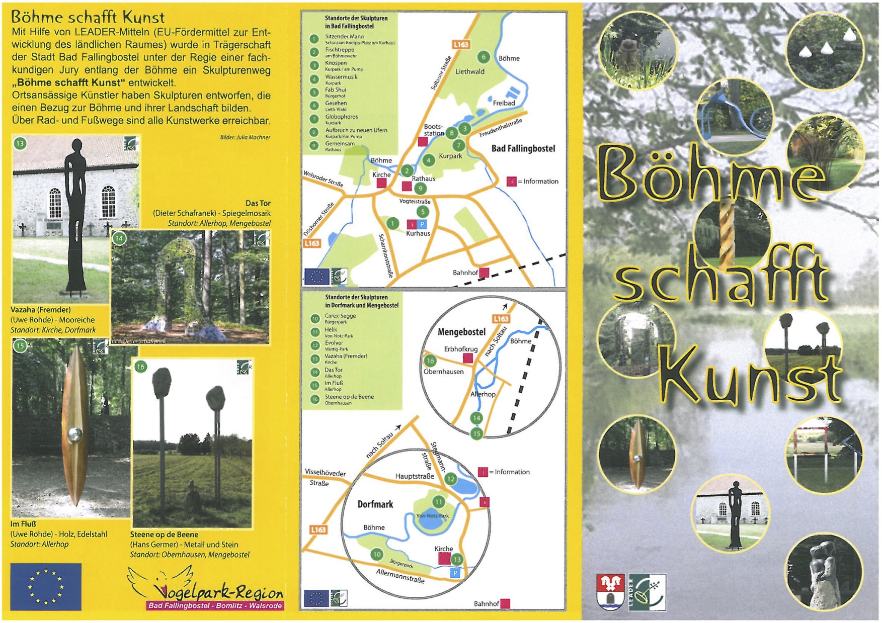 Unser Heidefluß Böhme verbindet als weitgehend natürlich verlaufendes Fließgewässer die Ortschaft Dorfmark mit den nächsten Orten im Böhmetal. Um ihre Eigenschaft als verbindendes Element und den besonderen Naturraum zu betonen, ist mit Hilfe von LEADER-Mitteln (EU-Fördermitteln zur Entwicklung des ländlichen Raumes) ein Skulpturenweg Böhme schafft Kunst durch das Böhmetal entstanden. Ortsansässige Künstler haben Skulpturen entworfen, die einen Bezug zur Böhme und ihrer Landschaft bilden. Über Rad- und Fußwege sind alle Kunstwerke des Skulpturenweges Böhme schafft Kunst erreichbar. Einheimische und Besucher erhalten beim Erkunden des Weges Einblicke in die Besonderheiten einzelner Orte und in die einzigartige Landschaft entlang der Böhme.